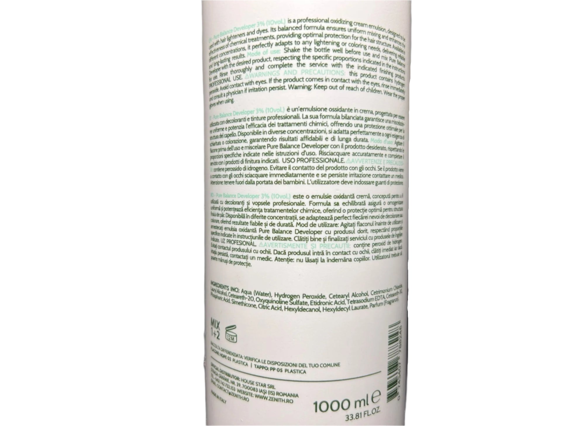Pure Balance Developer este o emulsie oxidantă cremă, concepută pentu a fi utilizată cu decoloranți și vopsele profesionale.